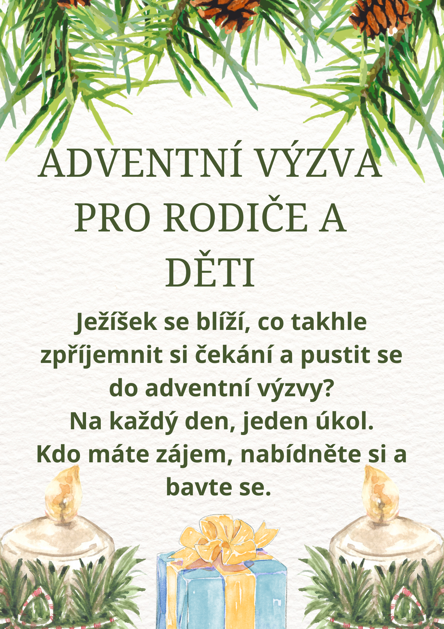 Milé děti a rodiče, připravili jsme si pro vás adventní výzvu. Na každý den jeden úkol na zpříjemnění adventního času. Kdo nemá možnost vytisknout si, je možné si seznam úkolů vyzvednout u hlavního vchodu. Krásný adventní čas přeje Mateřská škola Jílové u Prahy