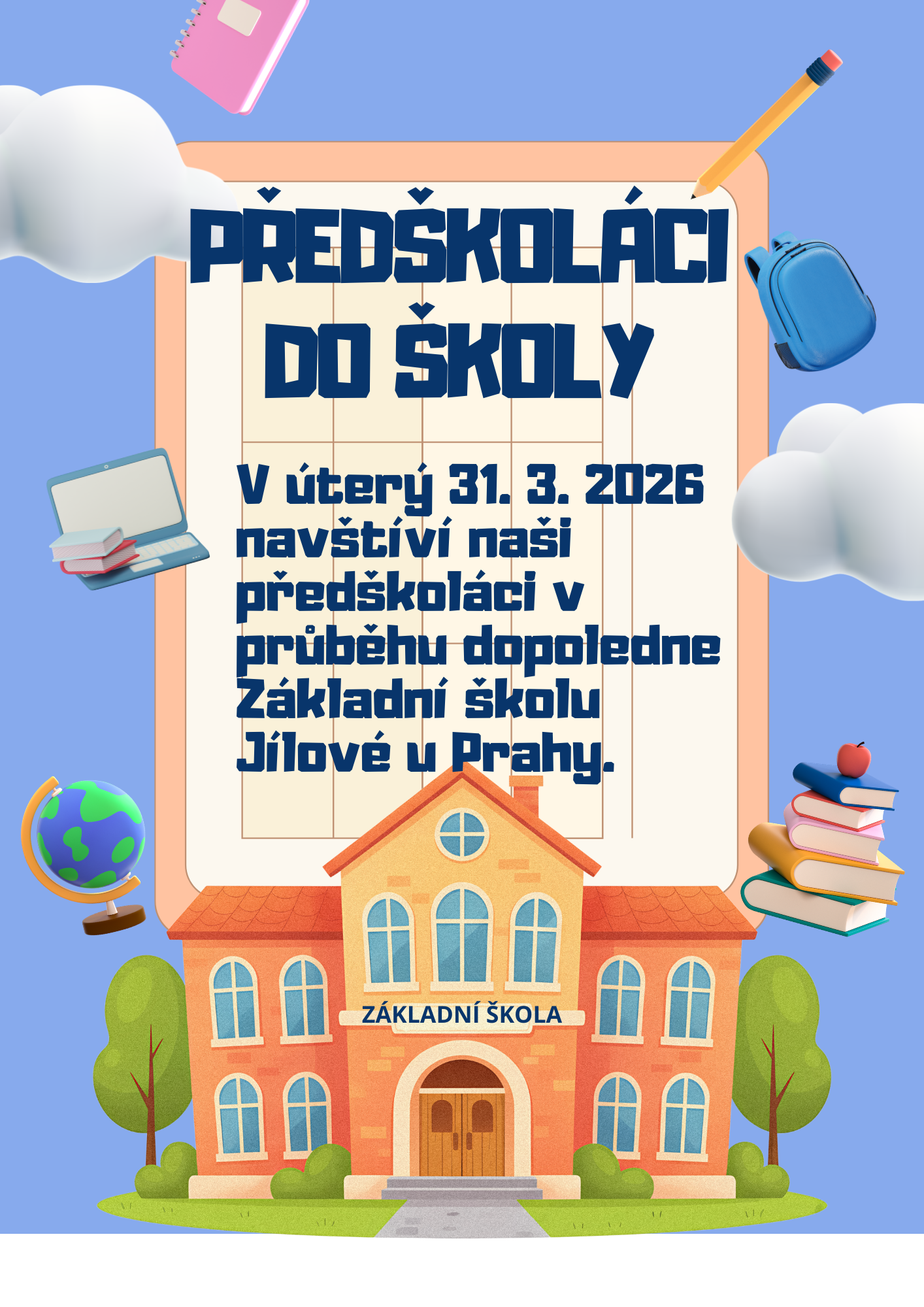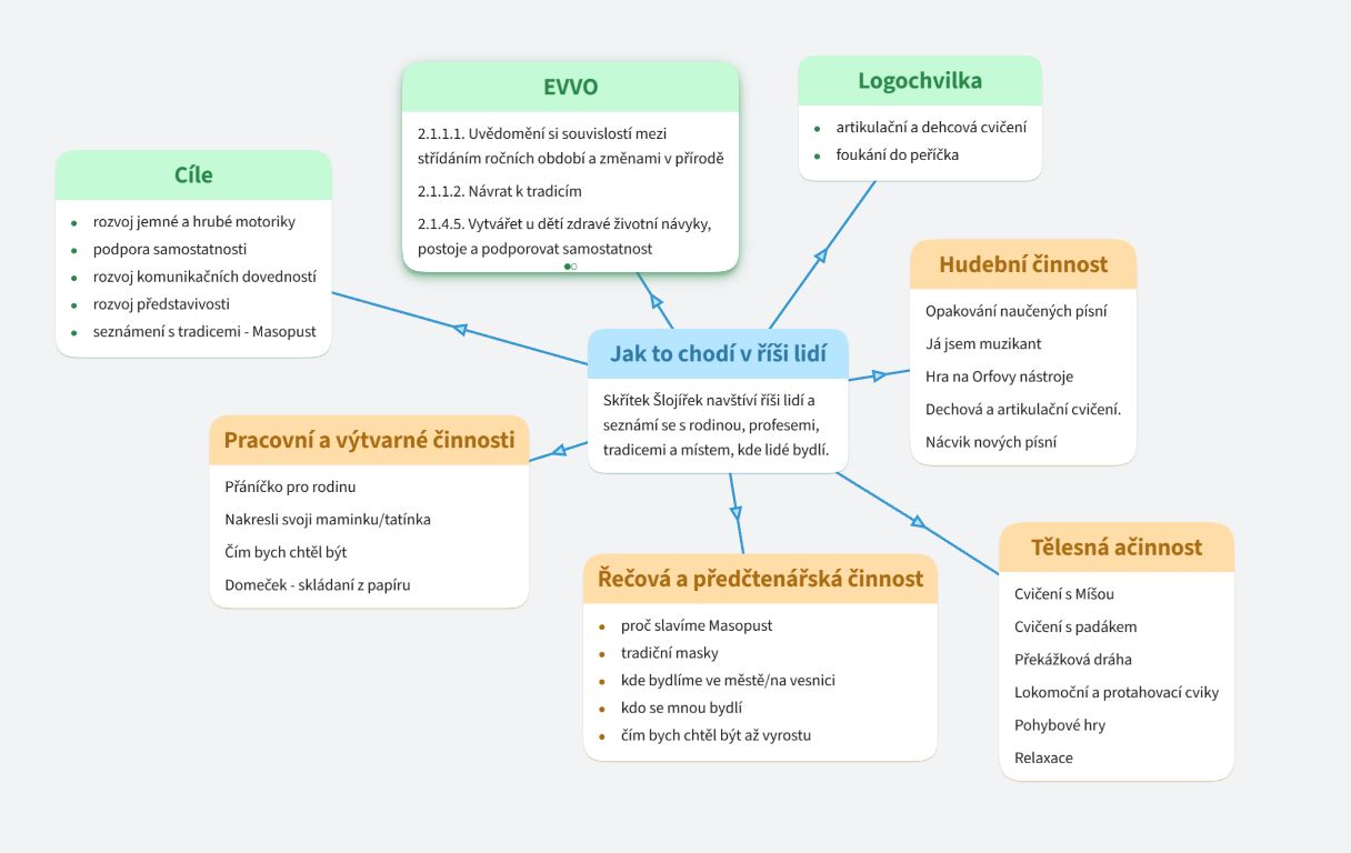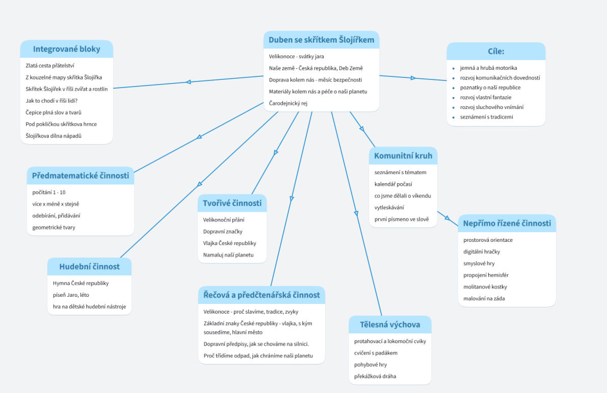 Dětem budeme celoročně předkládat spoustu materiálů, které je budou rozvíjet ve všech oblastech – grafomotorika, činnost jazyková, rozumová, sluchové analýzy, zrakové vnímání a rozlišování, matematické představy, hudební, výtvarné, tělovýchovné chvilky…