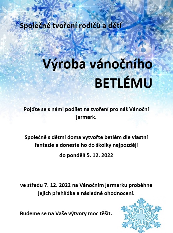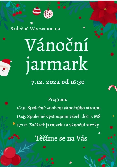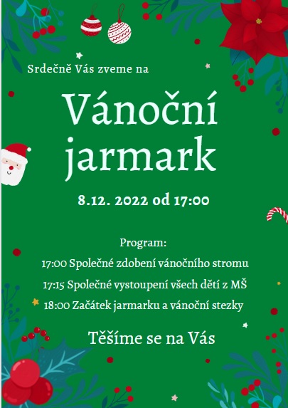 srdečně Vás zveme na vánoční jarmark, který se bude konat v MŠ Tyršova 7. 12. 2022 od 16.30h a v MŠ Pod Školkou 8. 12. 2022 od 17h. Opět pro Vás naše šikovné paní učitelky připravily zábavný a originální program plný úžasných nápadů. Těšit se můžete na společné zdobení vánočního stromečku, který později slavnostně rozsvítíme. Projdete si Andělskou a Vánoční stezku plnou zajímavých úkolů. Odnesete si dárečky vyrobené Vašimi dětmi. Uvidíte přehlídku betlémů vyrobených Vámi rodiči a dětmi. Poslechnete si vánoční hudební pásmo dětí ze všech tříd. Společně si zazpíváme a ochutnáme vánoční cukroví :-).
