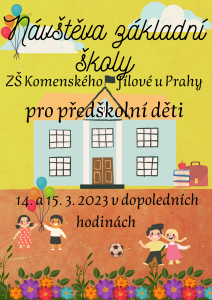 Milí rodiče, ve dnech 14. a 15. 3. 2023 navštívíme se našimi předškoláky Základní školu Komenského v Jílovém u Prahy. Děti budou ve třídách, kde budou moci vidět, jak vypadá opravdové vyučování. Pozdraví své kamarády ze školky:-). Seznámí se s prostředím školy, do které většina v září nastupuje. Těšíme se.