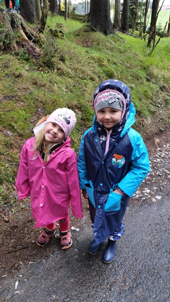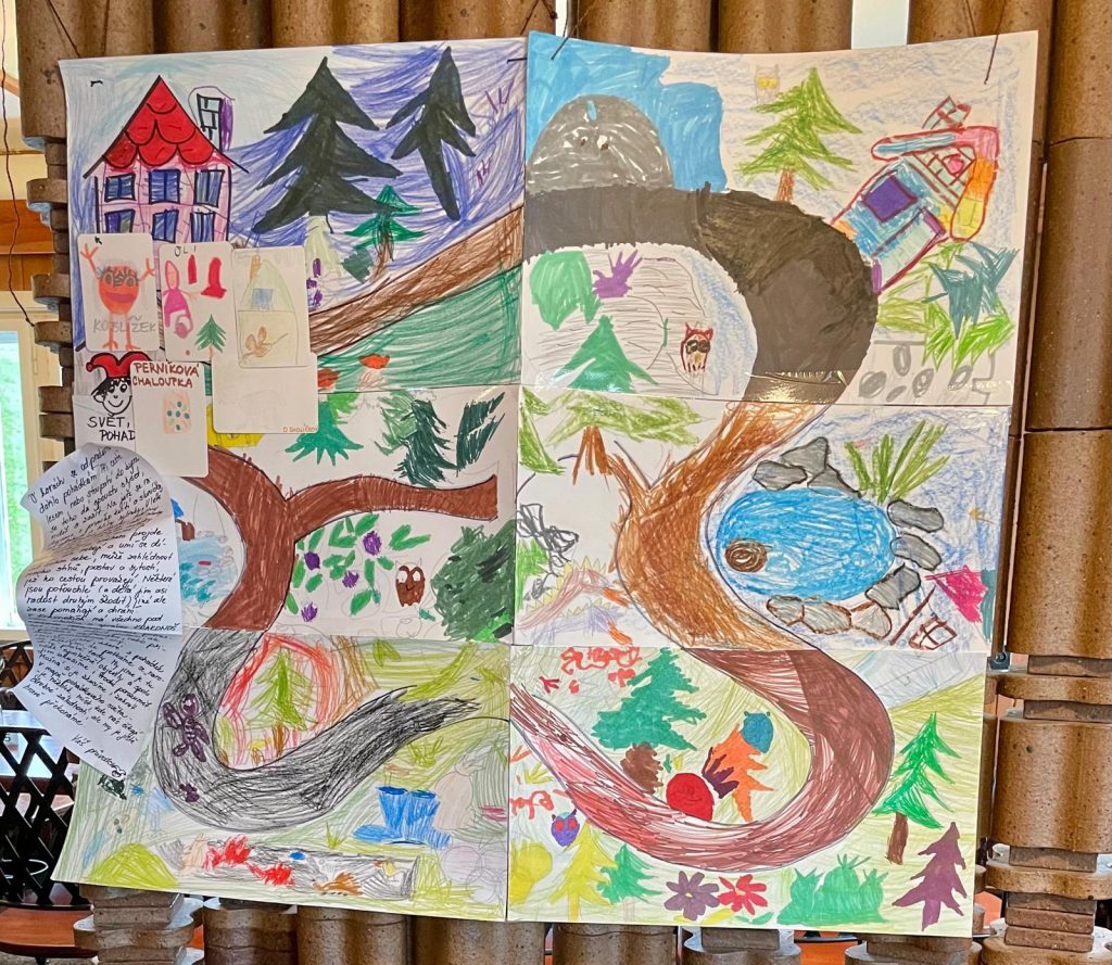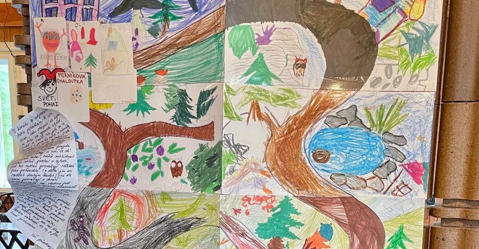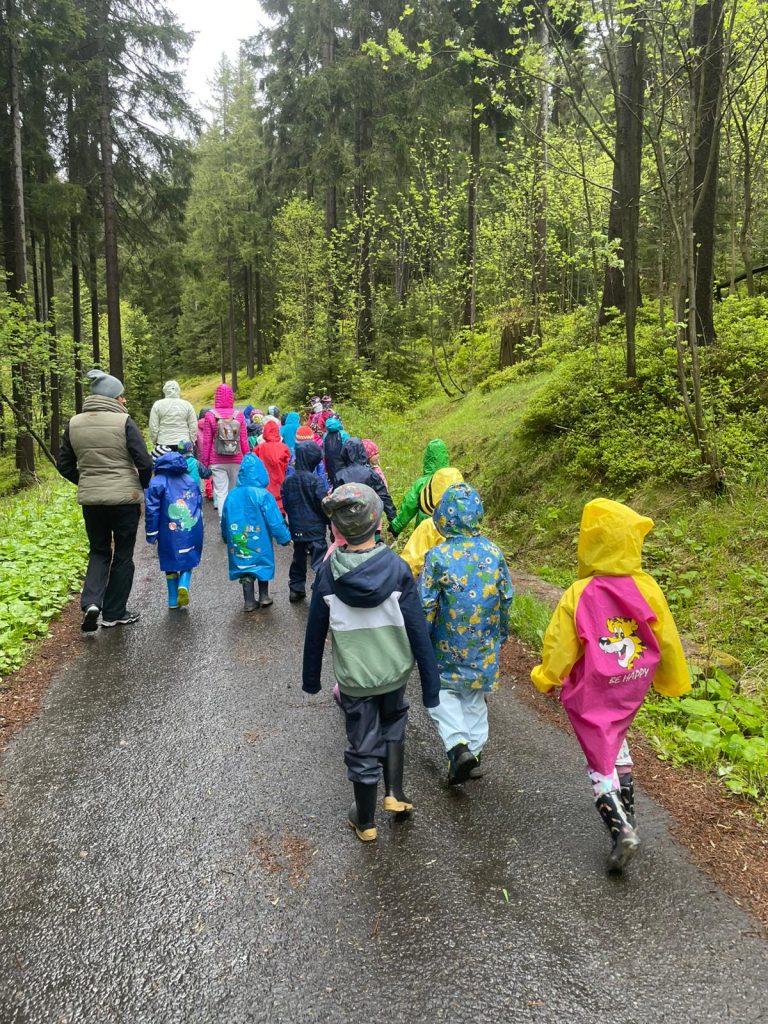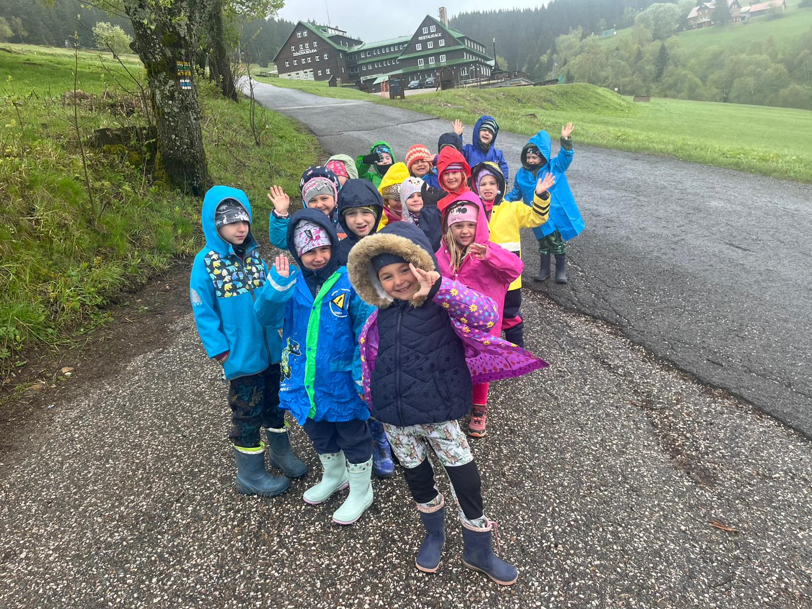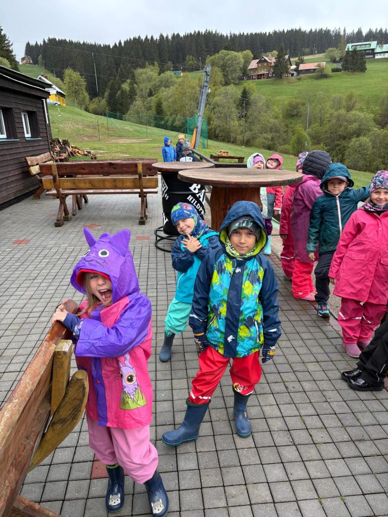 Posíláme první pozdrav z prvního dne na školce v přírodě. Naše velká tlupa dorazila dnes před polednem na chalupu. Po ubytování na pokoje a vybalení kufrů nás čekal skvělý oběd. Po obědě a odpočinku jsme využili chvíle bez deště a vyrazili jsme na krátkou procházku okolo chalupy, proběhnout se a protáhnout tělíčka. Navečer potom paní učitelka Gábina seznámila děti s tím, co nás čeká a že náš pobyt zde bude doslova pohádkový. Děti kreslili pohádkové erby a vybarvovaly pohádkovou cestu, kterou jsme si vyvěsili v jídelně. Po večeři a hygieně se z pokojů ozývaly pohádky a během chvilinky se ve všech postýlkách spinkalo.